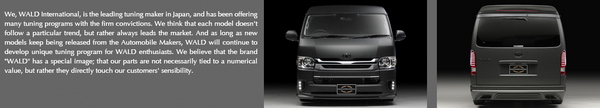 WALD は 今や世界を中心に活動するエアロパーツメーカーで、セダンからプレミアムカーまで数多くのエアロパーツをリリースし多くのファンを持っているメーカーです。全商品掲載済みですので是非ご利用くださいませ。